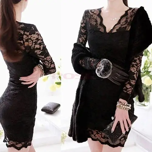 Sale Women Sexy V-Neck Lace Floral Slim Long Sleeve Clubwear Cocktail Bodycon Dress