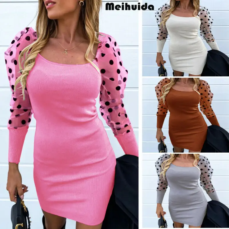 - Hirigin Sexy Mesh Knitted Patchwork Dress Women Polka Dot Puff Long Sleeve Slim Dresses Autumn O Neck Party Casual Mini Vestidos