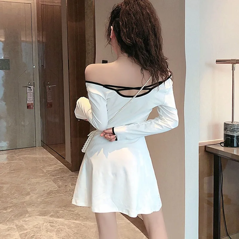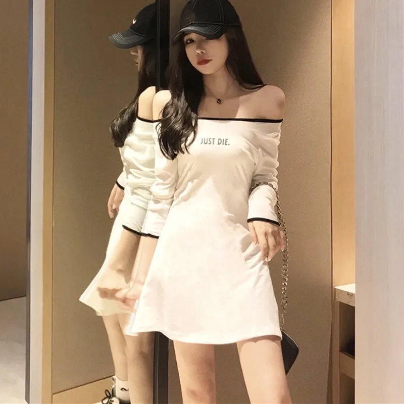Purchase Letter Print Slash Neck Sexy Mini Dress Women New Korean Casual Long Sleeve Dress Sweet Fashion Sli