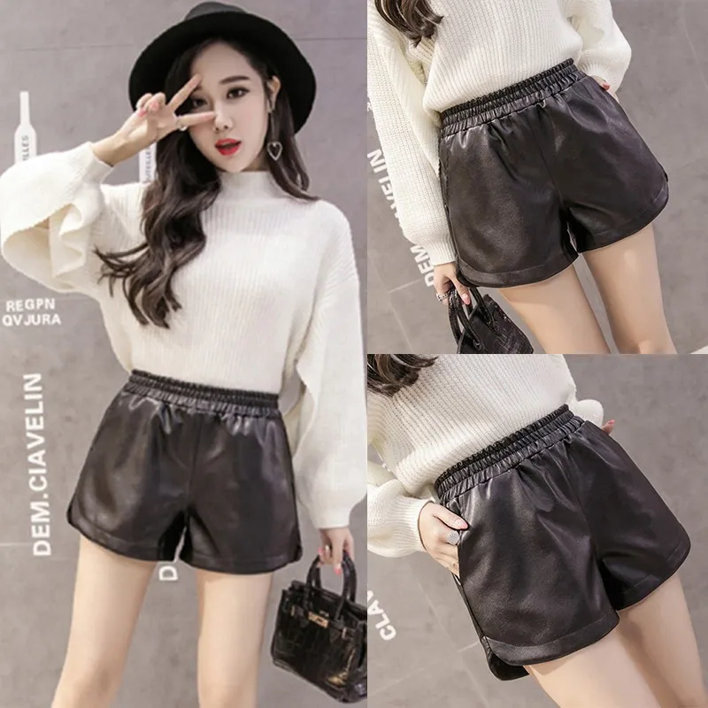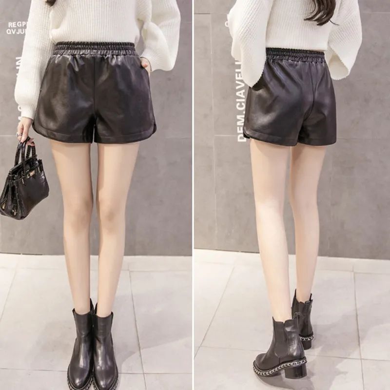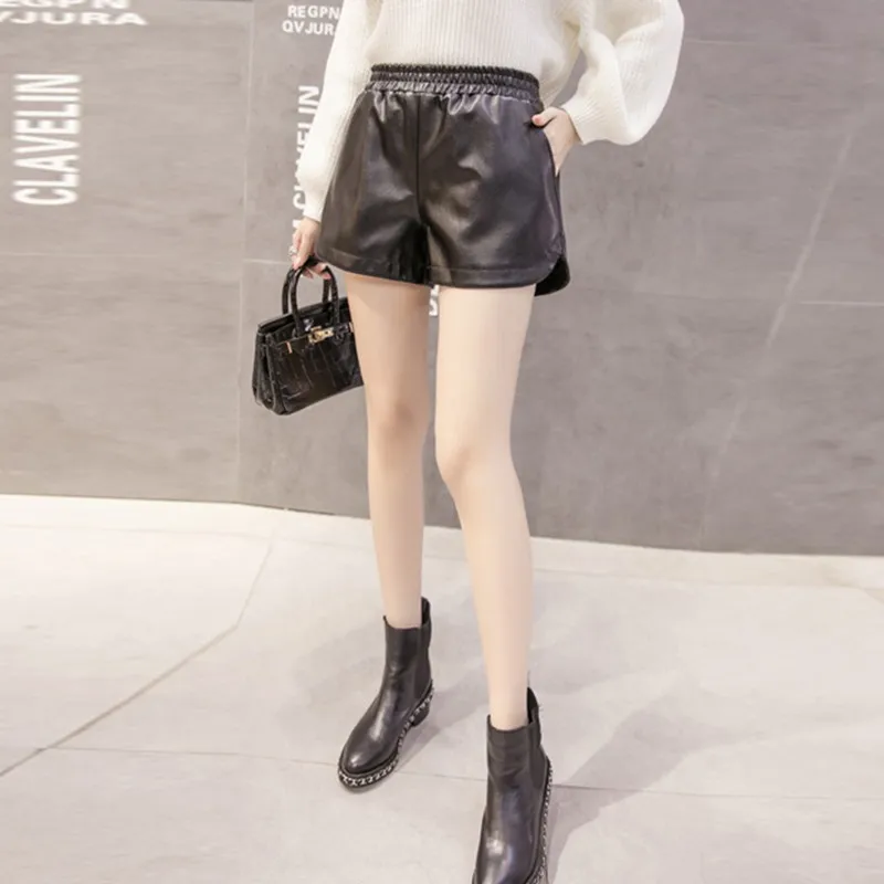 Sale Vrouwen Mode Herfst Winter Comfy Effen Kleur Casual Wijde Pijpen Hoge Taille Losse PU Lederen Short