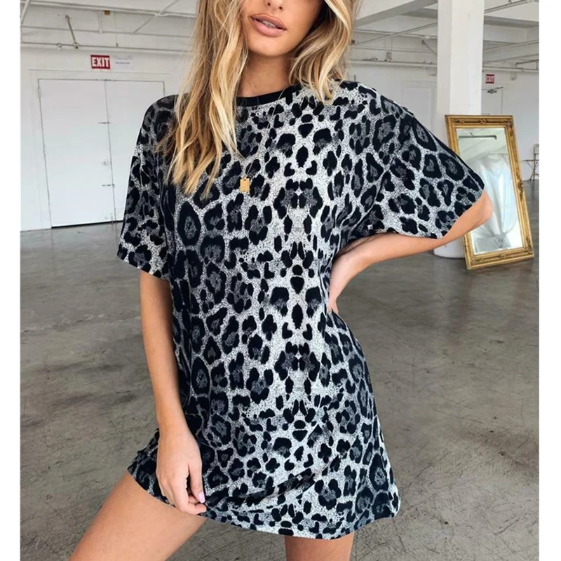 Bargain Women Summer Leopard Print Loose T-Shirt Dress Fashion Short Sleeve Ladies Party Beach Mini Dress S